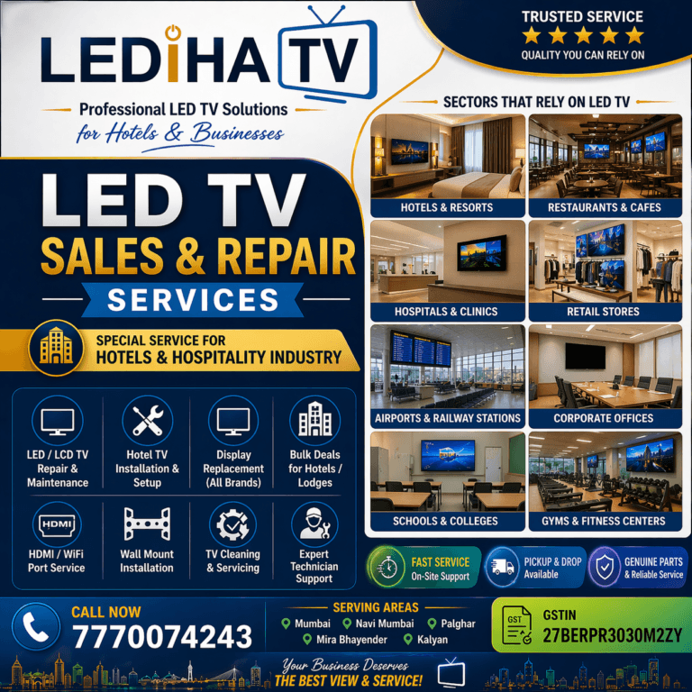 You are limited to finding the best LED/LCD TV repair solution without visiting Lediha Electronics.Osea tech Mumbai Best Services In Mumbai . Between the important models and brands that our team serviceability includes are those of Samsung, Sony, , Panasonic, is a Philips, Videocon, Micromax, on the Sansui, Toshiba, among others, Mi, Haier, Vu, Motorola to LG, Thomson, Onida, Sharp, Lloyd, Intex, Kodak, which Bpl, Weston, Mitashi, Tcl, Sanyo, etc.We offer myself available online and at 7770074243, so scheduling an appointment with us is quick.